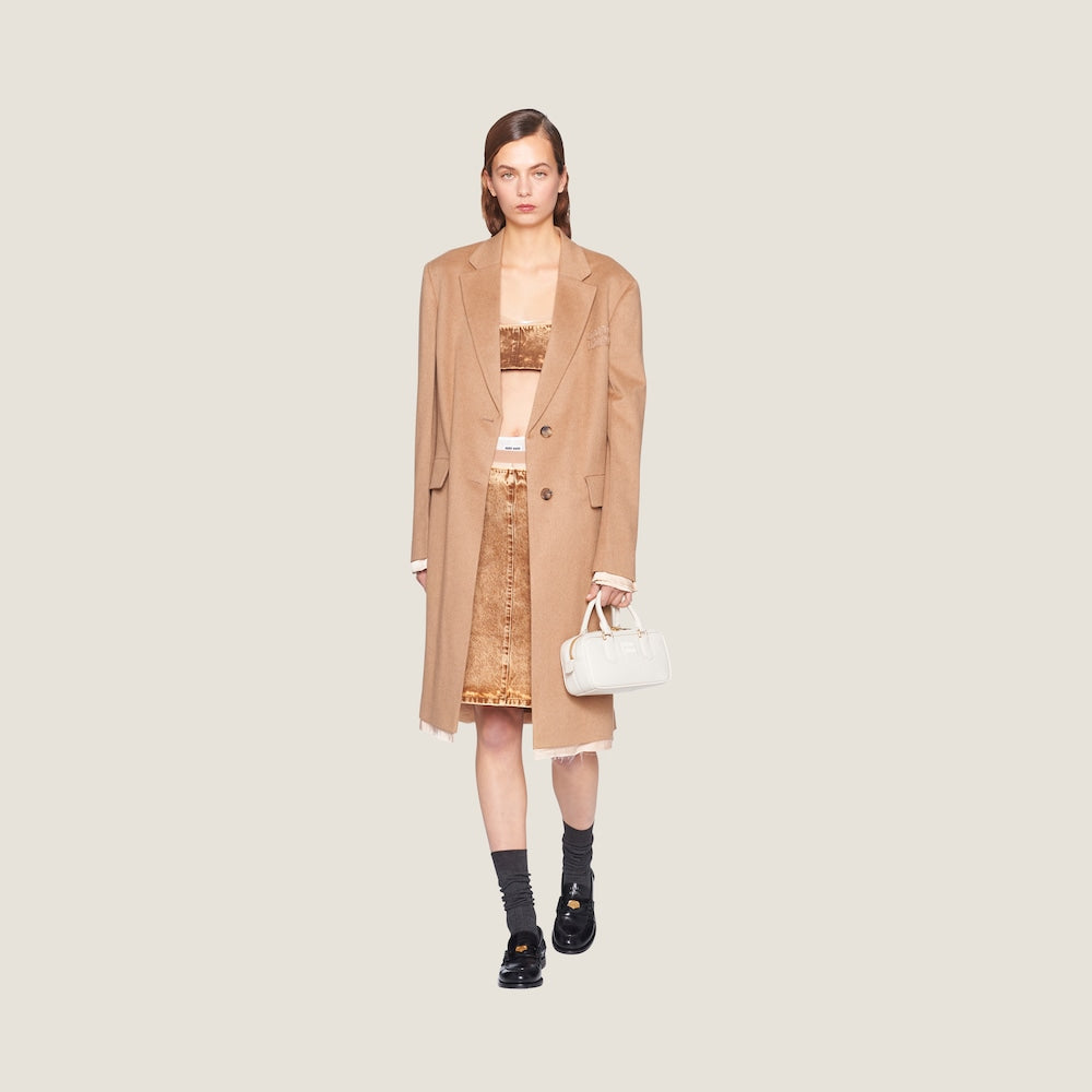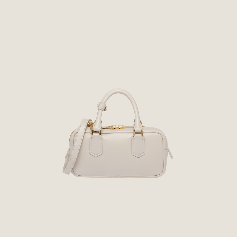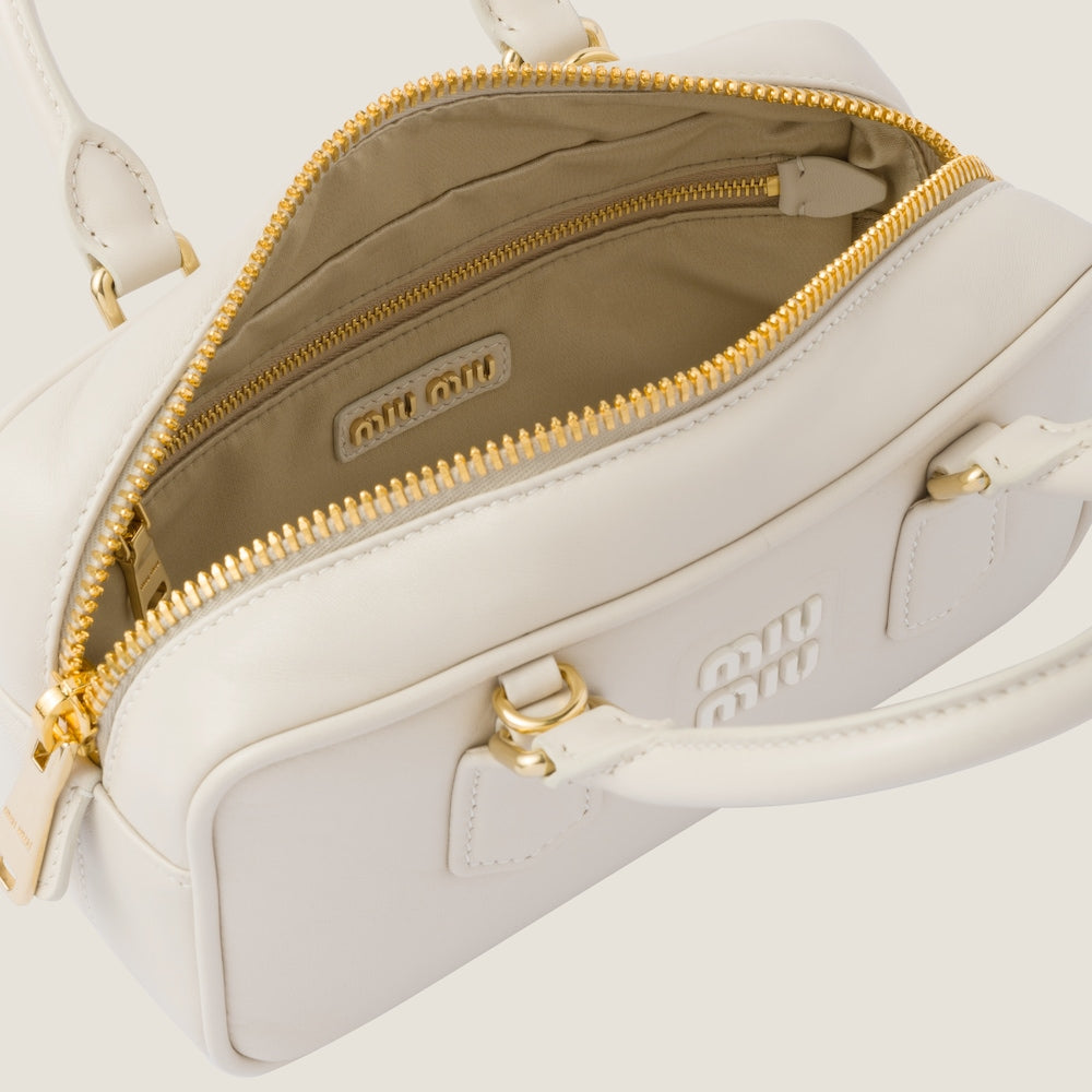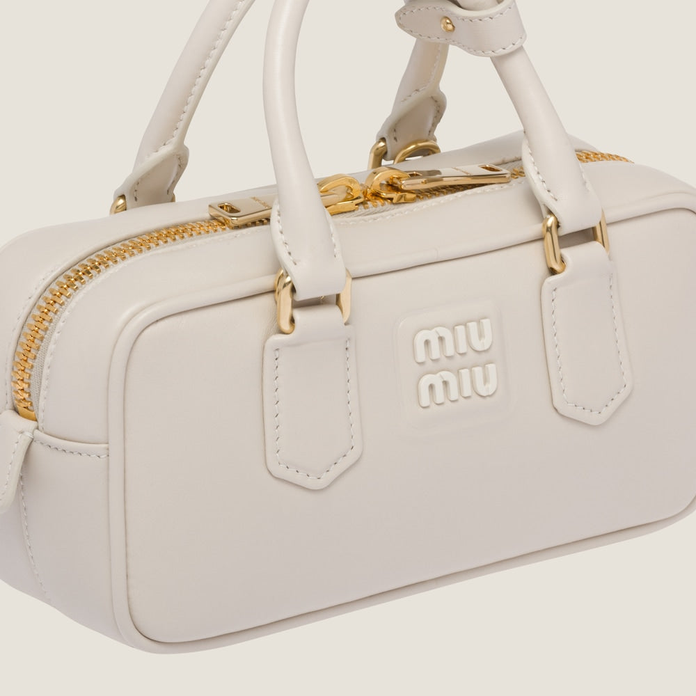 ファッションは現実に対する反応を物質的な形に変換する手段であるという概念を反映したアルカディ レザーバッグ。薄いパデッド加工を施してボリューム感を出したコスモポリタンなスタイル。メタルパーツと同色のMIU MIU ロゴが、装飾と機能の境界を越え個性的でアイコニックな美しさを際立たせています。